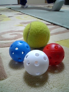 カラーボールはゴルフ用のやつで、近所のゴルフショップで6個入り200円弱でした。