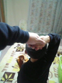 体を回すものの、手は残して反射を導き出す切欠を作る動作を教えます。これを繰り返し何度もやります。写真でみるとなんとなくわかると思いますが、私は手を左側に返して正しい動きに導いています。