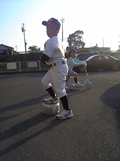 投げるとき、体重が前に乗って行かないので、壊れた鍋を使って投球練習をしました。