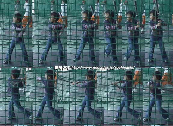 これで打ちますと、ミート時にトップハンド(右打ちならば左手)の掌が下を向き、ボトムハンド(右打ちならば右手)の掌が空を向かないときれいにミートできません。ですから、これで合理的な腕の使い方を覚えることができます。(注:本来は、大人が片手で打つもののようです)